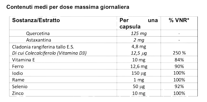 Astaxantina polvere (biomassa algale di Haematococcus pluvialis Flotow, tallo) titolato>=5% astaxantina, Vitamina E (d-alfa-tocoferolo acetato, maltodestrina), Cladonia Rangiferina tallo (Cladonia rangiferina (L.) Weber ex F.H. Wigg.) estratto secco titolato in Colecalciferolo 85.000-125.000 UI/g, gluconato di rame, Ioduro di Potassio, Sodio Selenito. Colorante: carbonato di calcio.